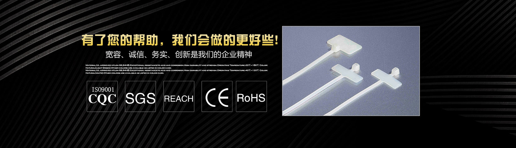 本公司專業(yè)生產(chǎn)銷售尼龍扎帶、特殊型扎帶、吸盤(自粘式定位片)、塑料膨脹管、尼龍壓線帽、電纜防水接頭、鋼釘線卡、R型線夾、飛機(jī)型線夾、瓷磚定位十字架、固定座、纏繞管、異型管、齒型管、號碼管、熱縮管、黃臘管、扎絲、鋼管蓋等系列產(chǎn)品。 我們擁有先進(jìn)的檢測設(shè)備和雄厚的技術(shù)力量,并不斷優(yōu)化生產(chǎn)流程,規(guī)范生產(chǎn)環(huán)節(jié),加強(qiáng)完善質(zhì)量控制系統(tǒng),以優(yōu)異的品質(zhì)深得海內(nèi)外客戶的一致好評。